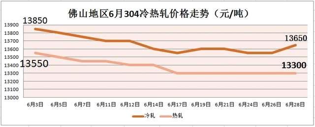 6月不锈钢震荡下跌,在镍价期货弱势的氛围之下,304冷轧月内跌200;热轧月内跌250。201冷轧月内跌300;热轧月内跌200。