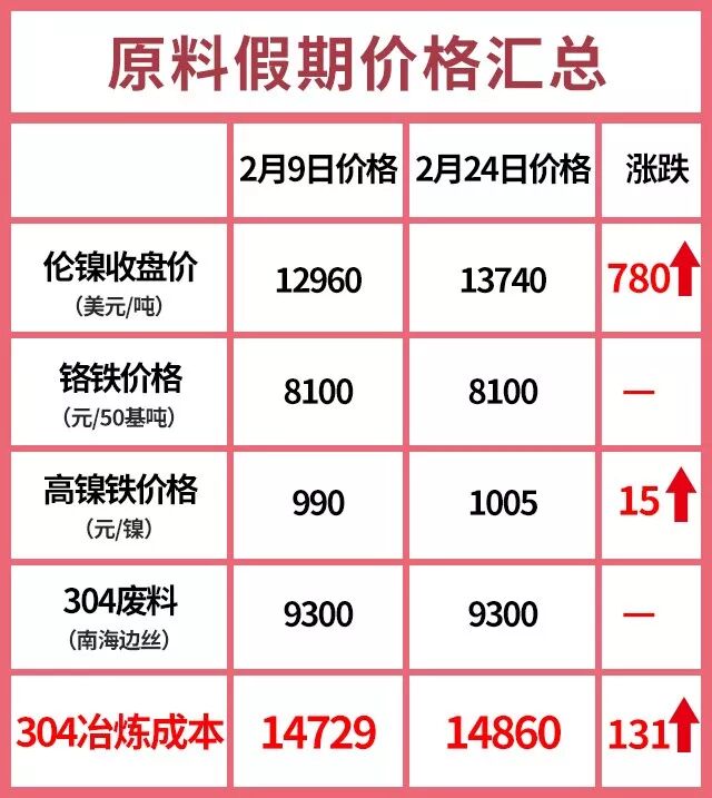按照各原料涨幅做计算的话,年前与年后相比,304冶炼成本上涨高达131元/吨,为节后价格的走强提供了支撑。